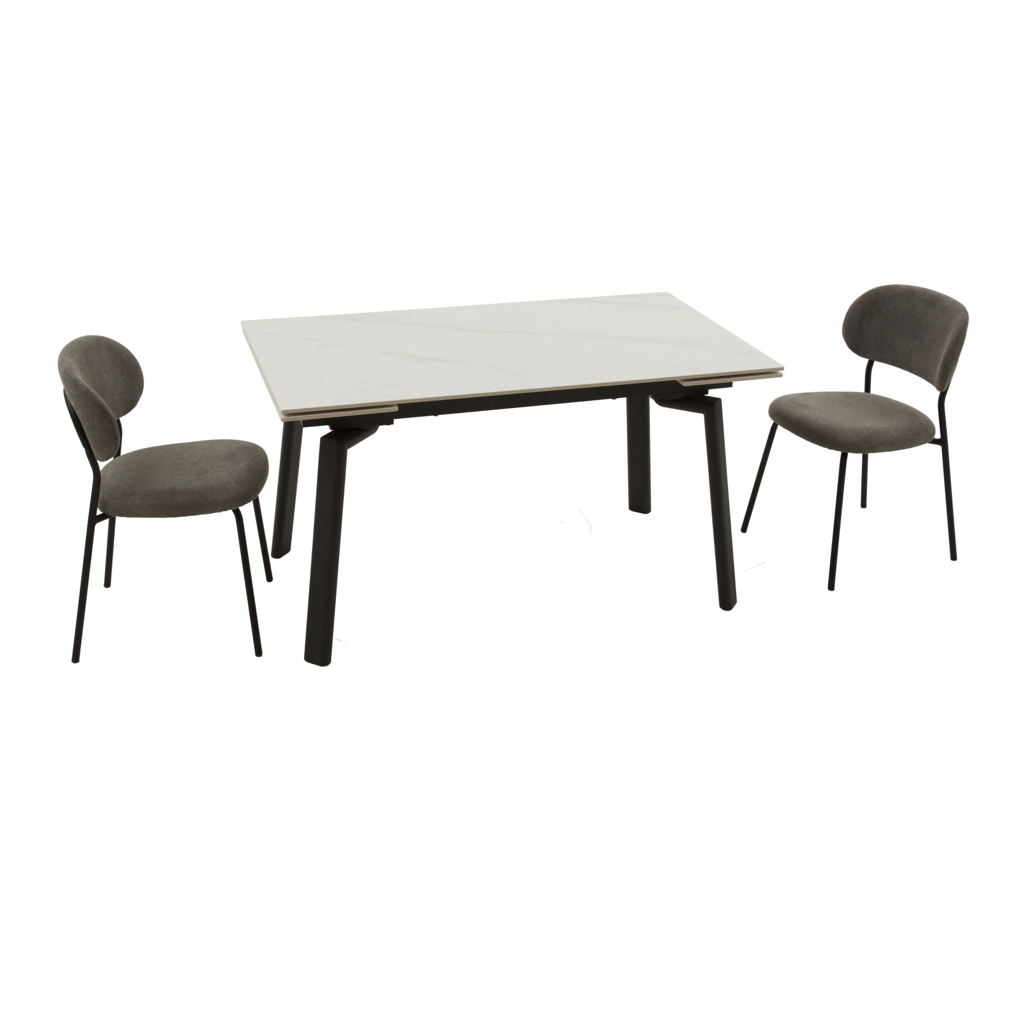 Masa SONIC cu blat dreptunghiular din ceramică mată, în nuanțe elegante de ALB cu insertii moderne marmorate, este alegerea perfectă pentru orice spațiu modern. Designul său sofisticat, completat de picioarele metalice negre, aduce un plus de stabilitate și rafinament în zona de dining.