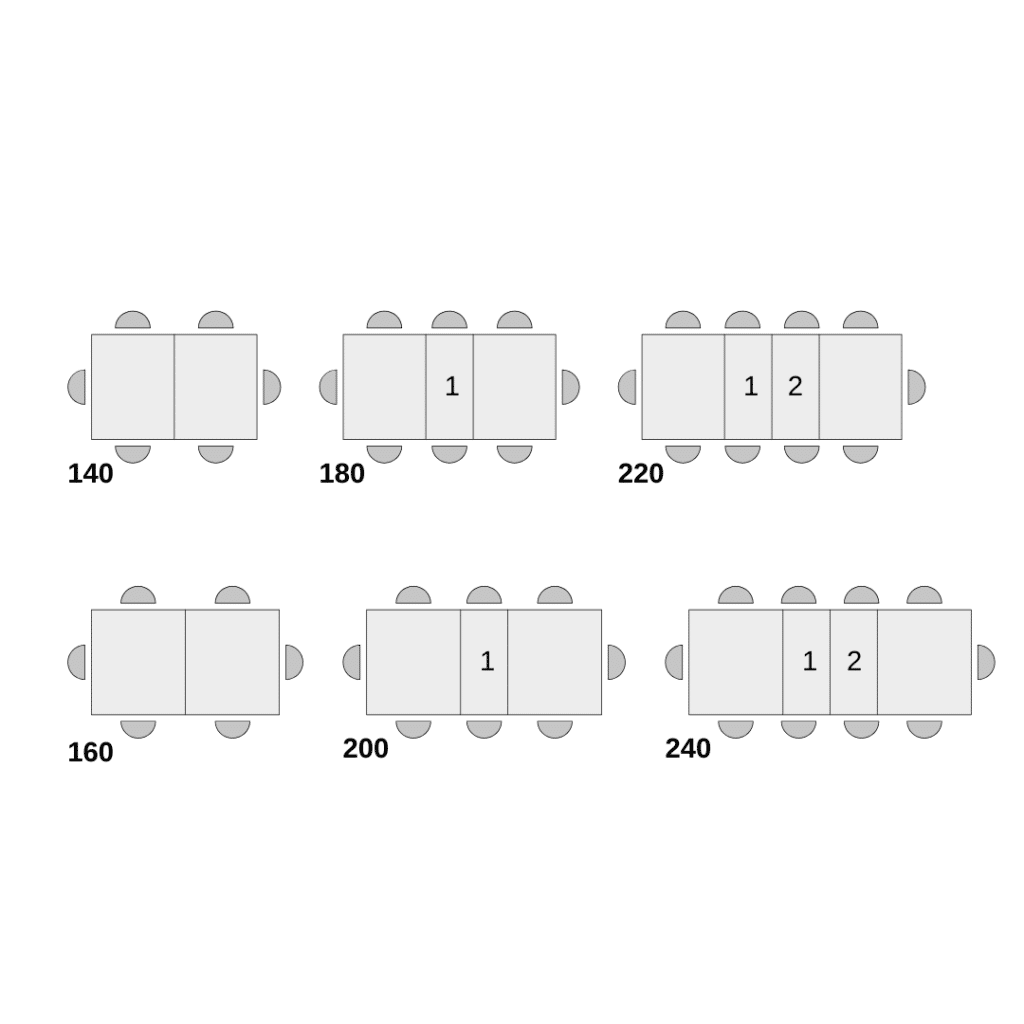 - Deschis cu două extensii: 220 x 90 x h74 cm – 10 locuri