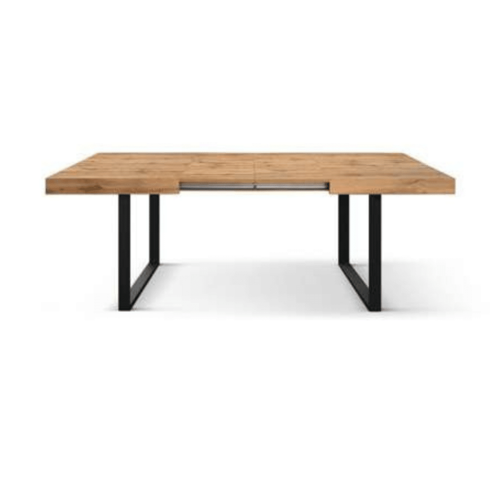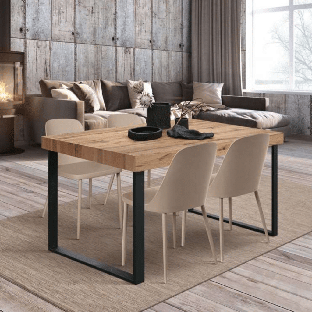 Masa extensibilă Desire, cu picior metalic în formă de U, este soluția ideală pentru orice sufragerie modernă. Cu un design elegant și funcțional, această masă dining oferă spațiu generos pentru până la 12 persoane, fiind perfectă pentru reuniuni de familie sau cine cu prietenii. Blatul melaminat cu finisaj gri beton, rustic sau alb frasin, combinat cu picioarele negre din fier, aduce un plus de estetică industrială și durabilitate în orice ambient.