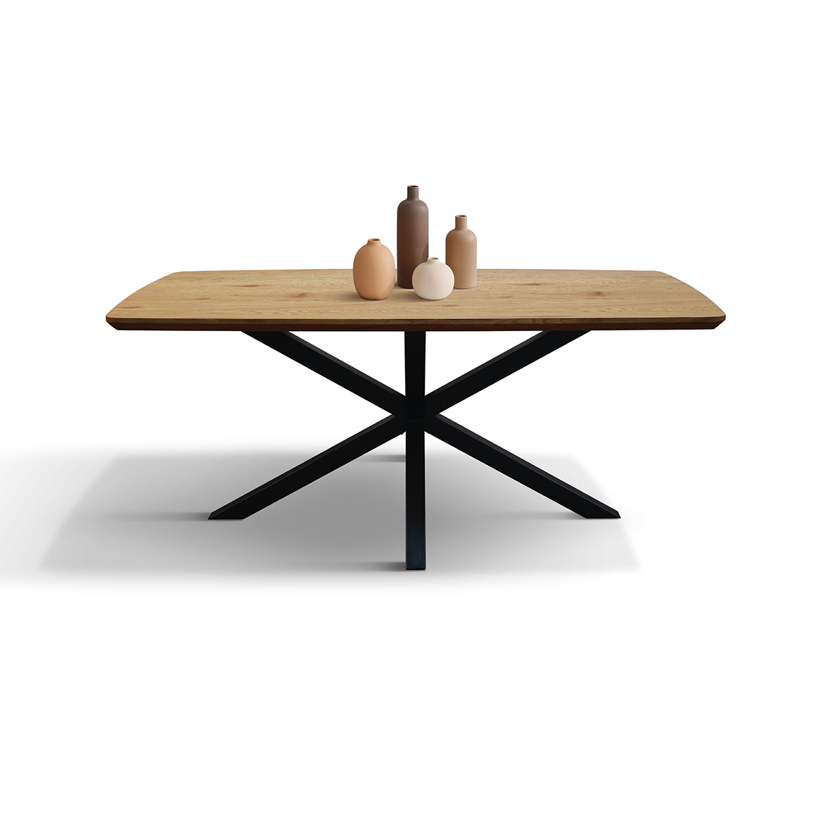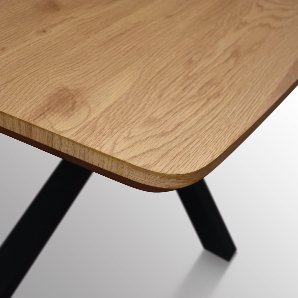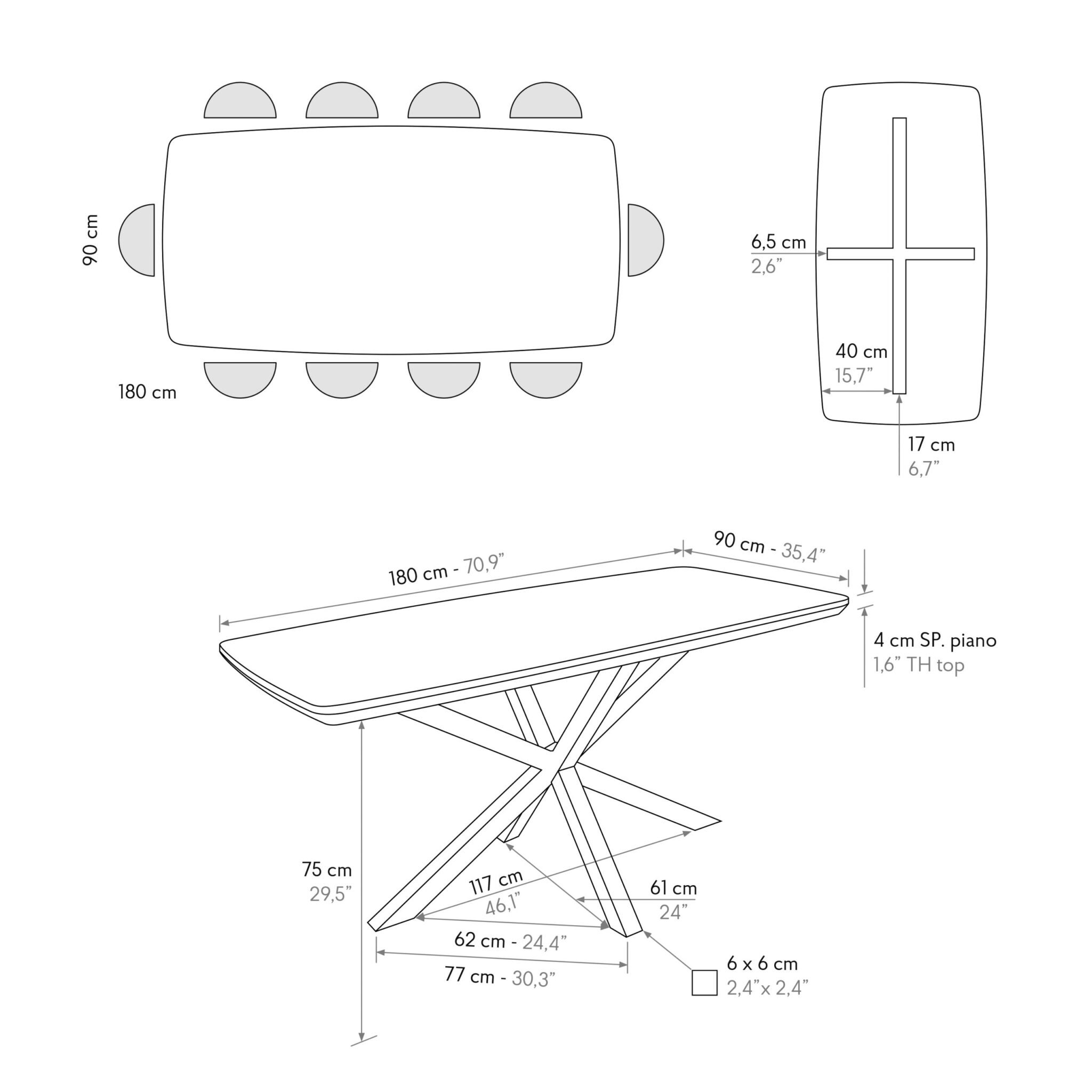 Blatul substanțial de 4 cm al mesei este susținut de picioare robuste din fier negru, cu un design contemporan. Încrucișarea distinctivă a picioarelor nu numai că conferă mesei un aspect sculptural și modern, dar asigură și o stabilitate impecabilă.