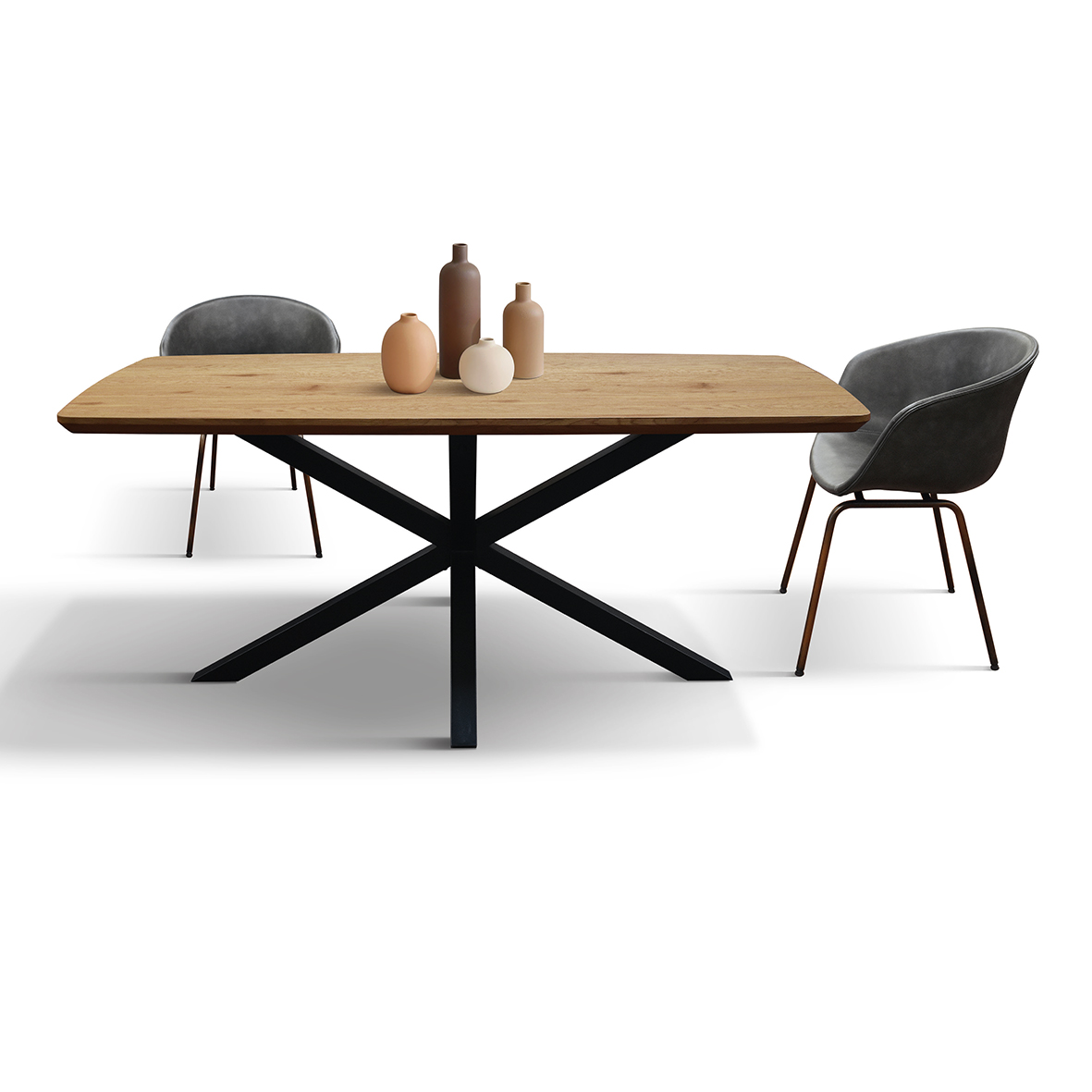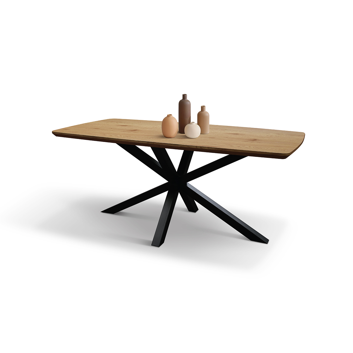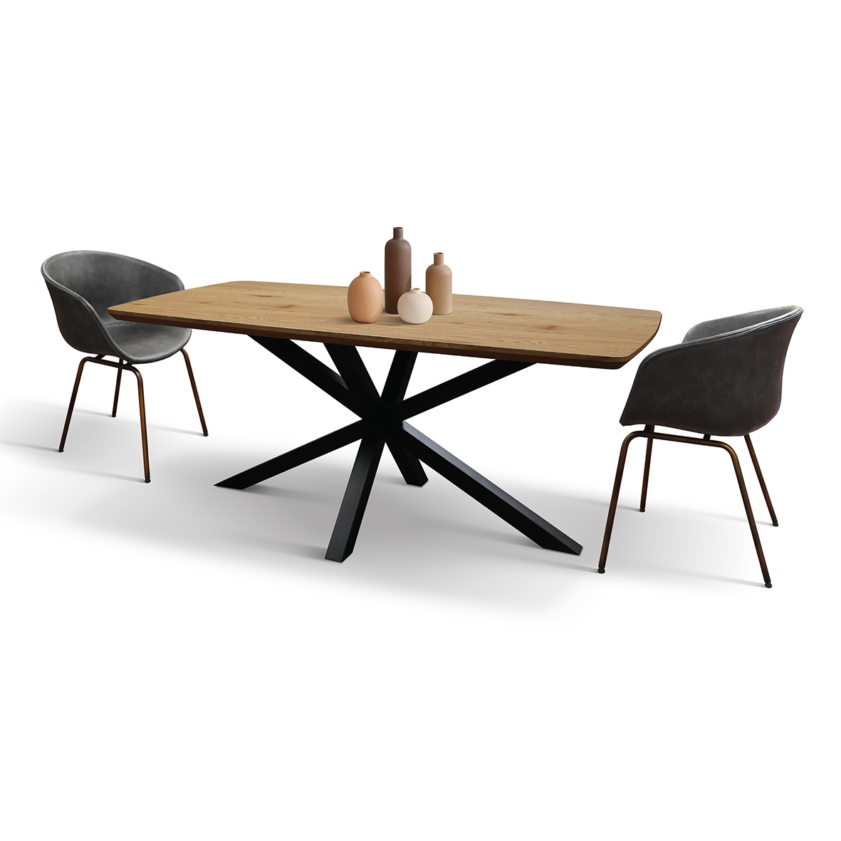 Blatul substanțial de 4 cm al mesei este susținut de picioare robuste din fier negru, cu un design contemporan. Încrucișarea distinctivă a picioarelor nu numai că conferă mesei un aspect sculptural și modern, dar asigură și o stabilitate impecabilă.