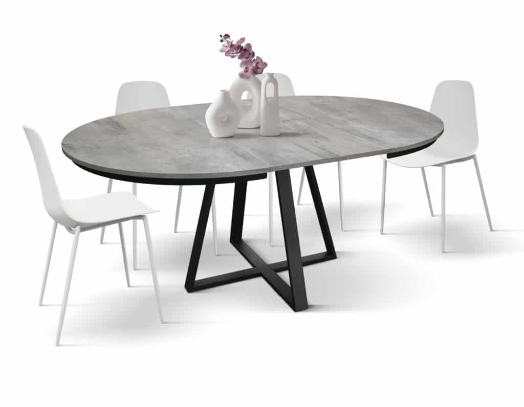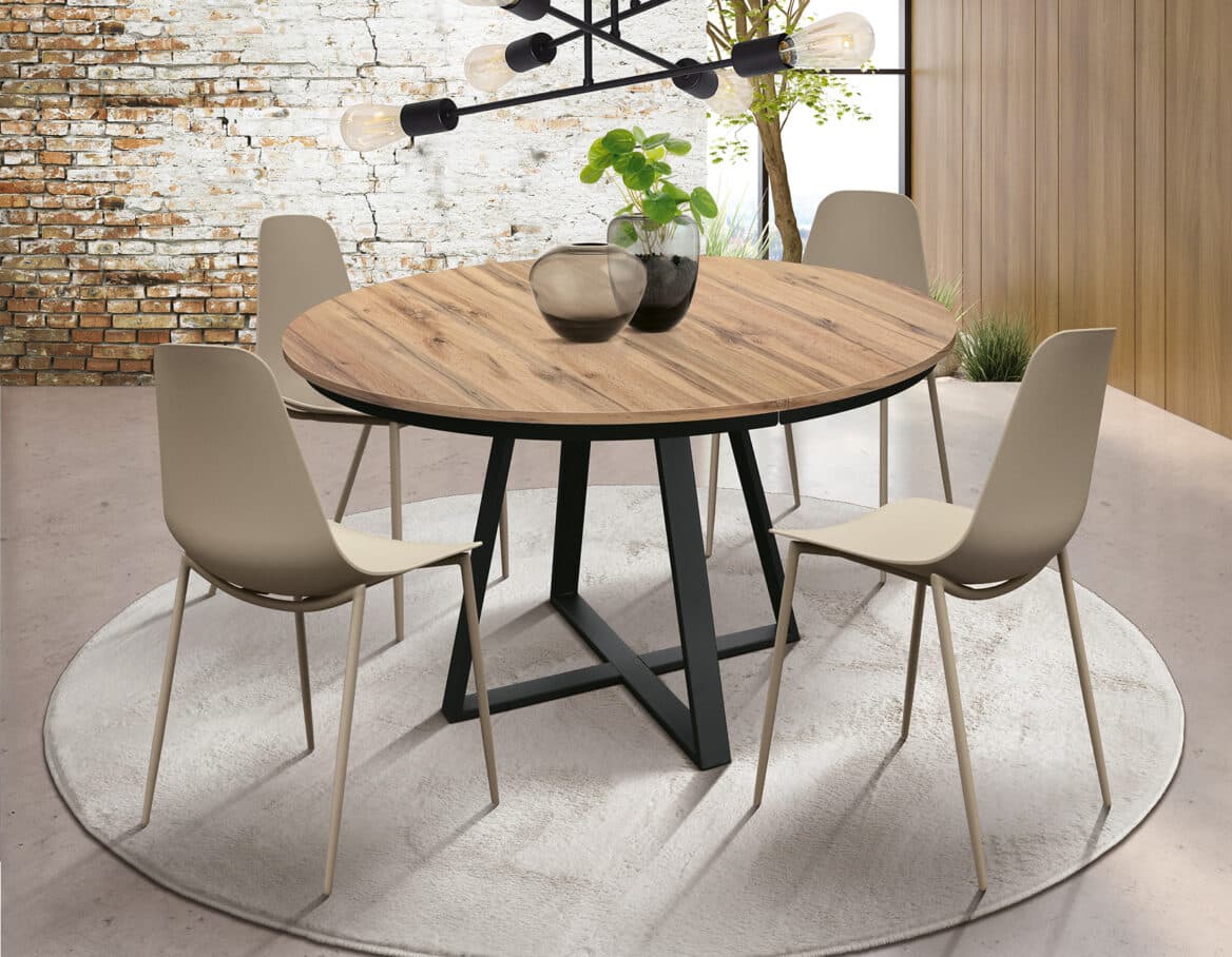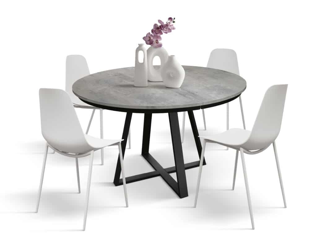 Masa Melania rotundă extensibilă de 120 cm este alegerea ideală pentru orice spațiu de dining care îmbină funcționalitatea cu un design modern și elegant. Cu un blat din pal melaminat disponibil în nuanțe precum gri ciment, rustic sau alb frasin, această masă aduce un plus de stil și căldură în orice sufragerie sau bucătărie. Picioarele metalice negre, în formă de H, conferă stabilitate și un aspect contemporan, perfect pentru amenajări moderne.