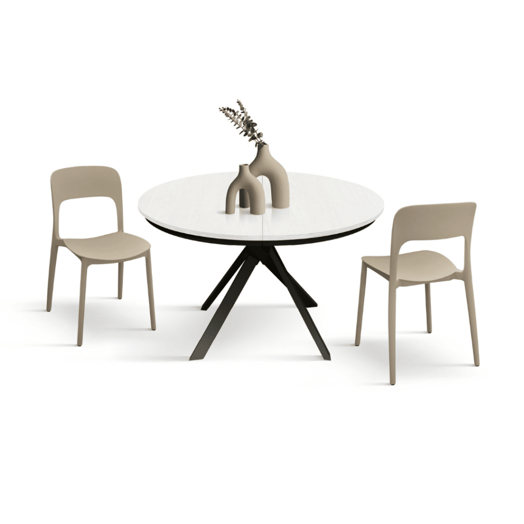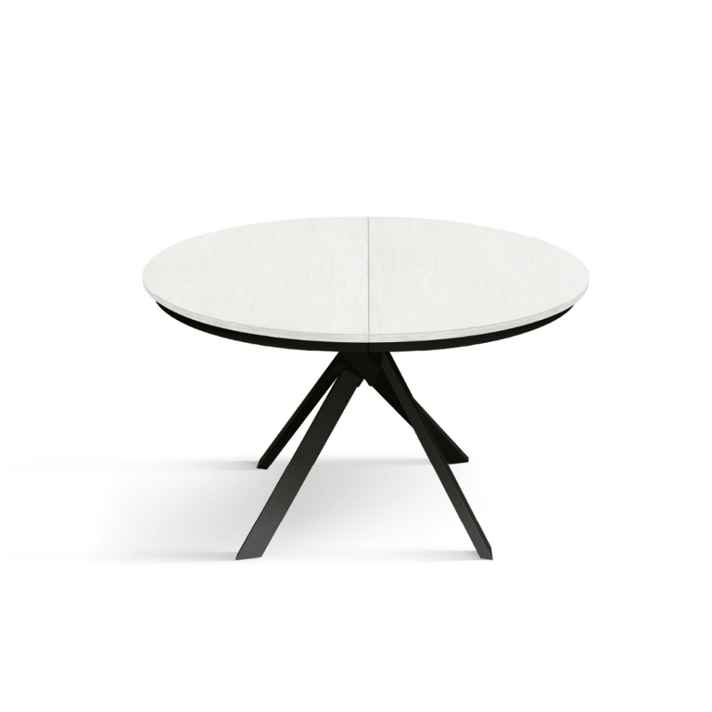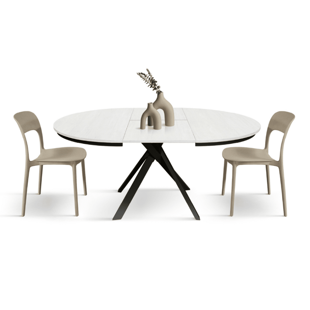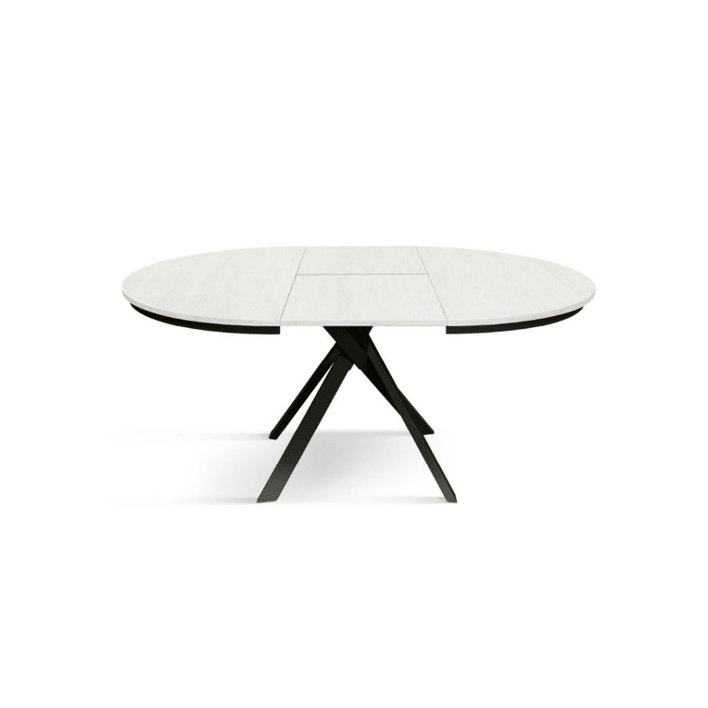 Masa rotundă extensibilă LILA este soluția perfectă pentru spațiile mici care nu vor să renunțe la eleganță și funcționalitate. Cu un blat alb frasin din pal melaminat și picioare metalice încrucișate, această masă dining aduce un plus de stil modern oricărei încăperi. Designul său compact și extensibil o face ideală pentru cinele în familie sau întâlnirile cu prietenii.