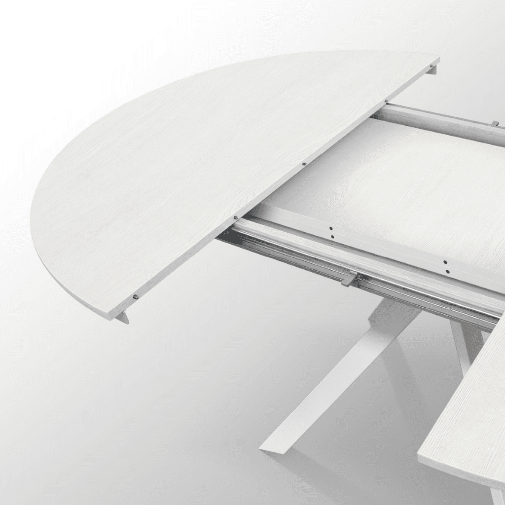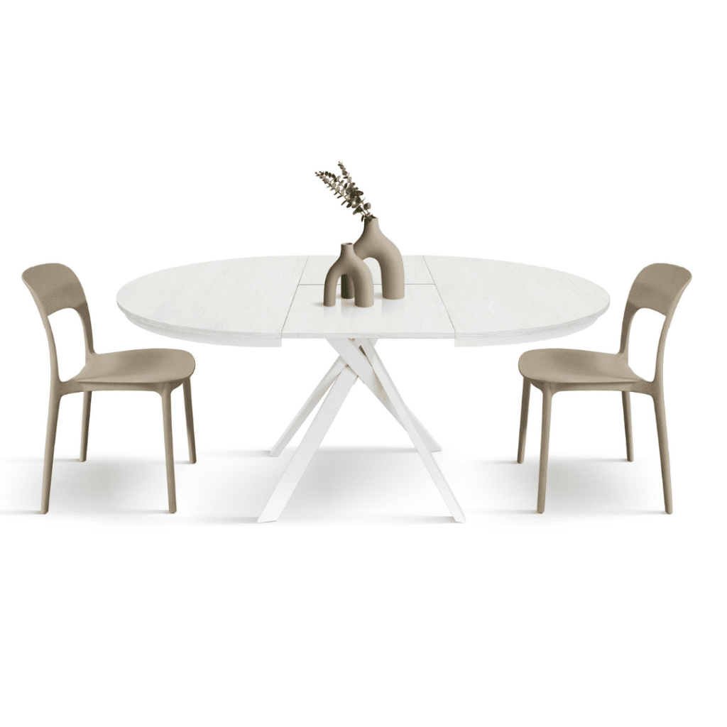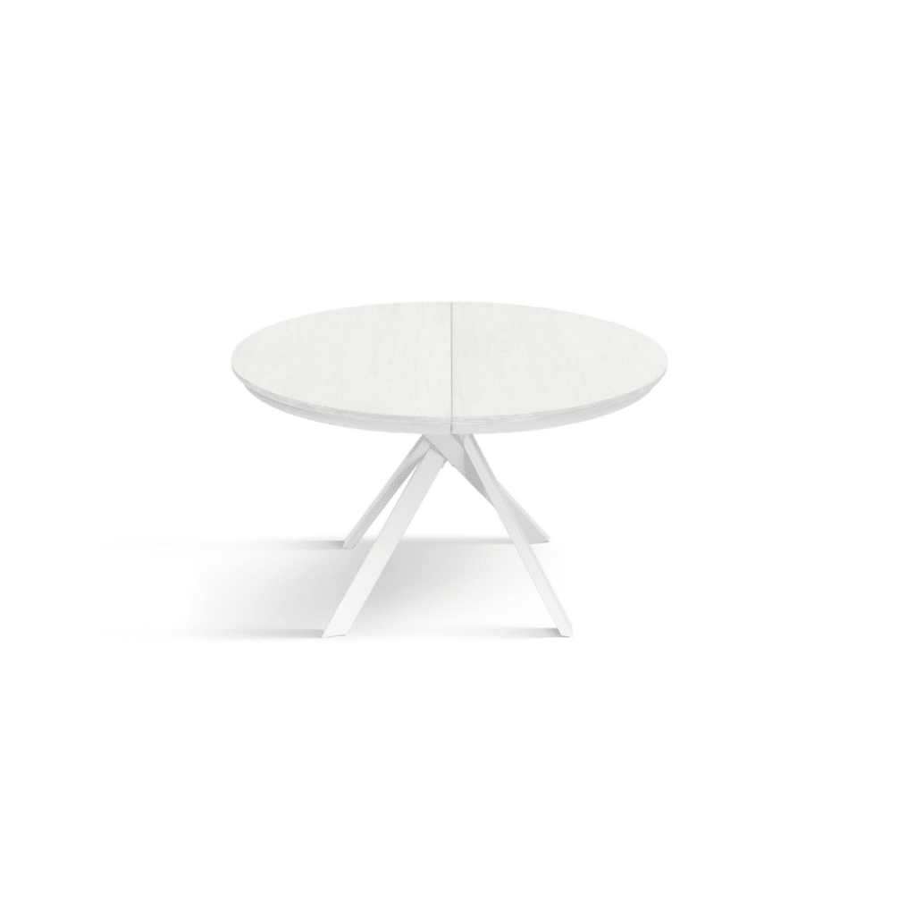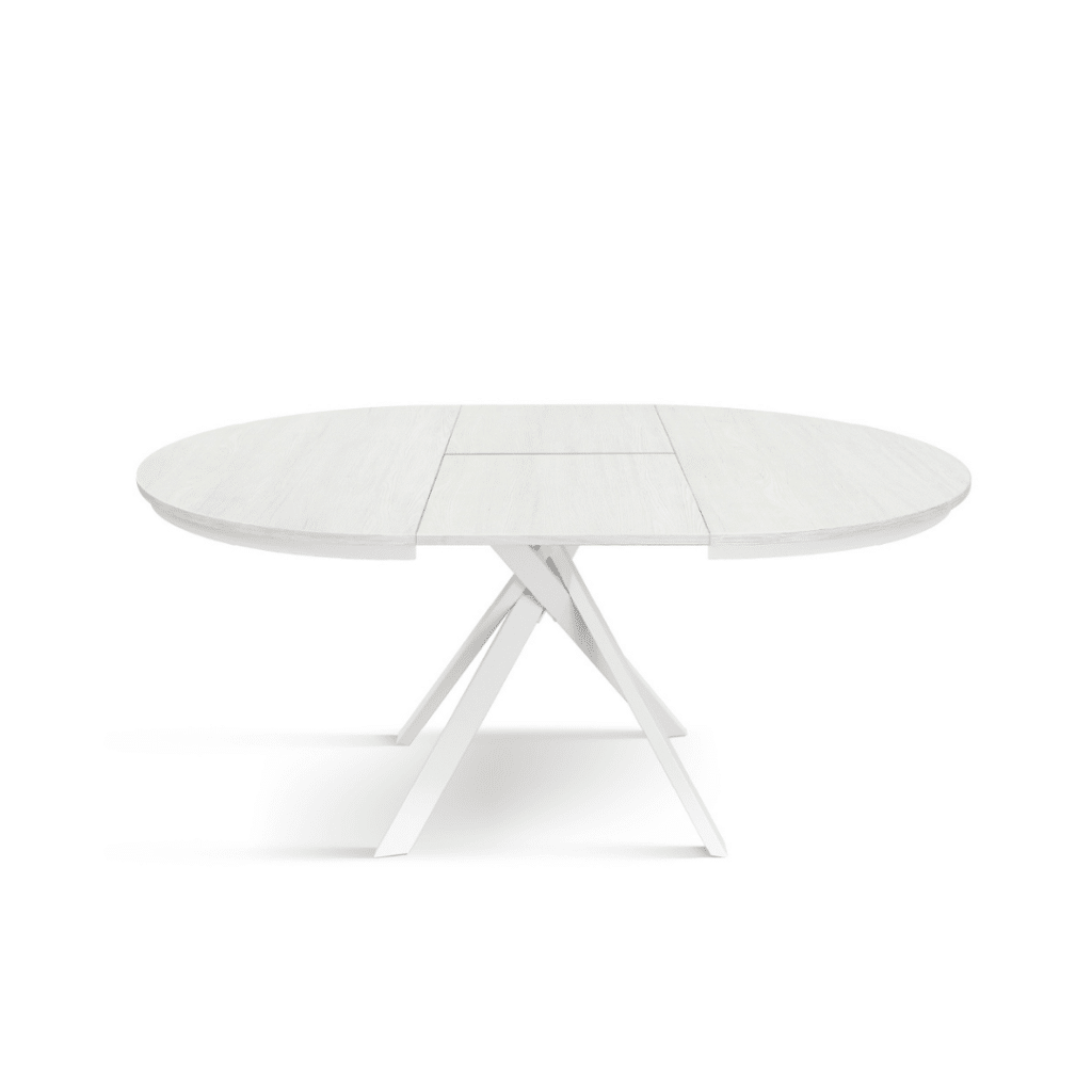Masa rotundă extensibilă LILA este soluția perfectă pentru spațiile mici care nu vor să renunțe la eleganță și funcționalitate. Cu un blat alb frasin din pal melaminat și picioare metalice încrucișate, această masă dining aduce un plus de stil modern oricărei încăperi. Designul său compact și extensibil o face ideală pentru cinele în familie sau întâlnirile cu prietenii.