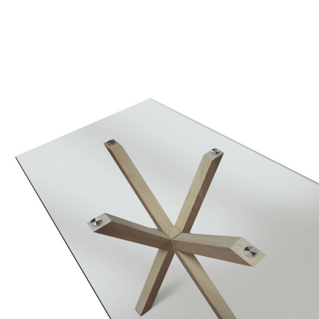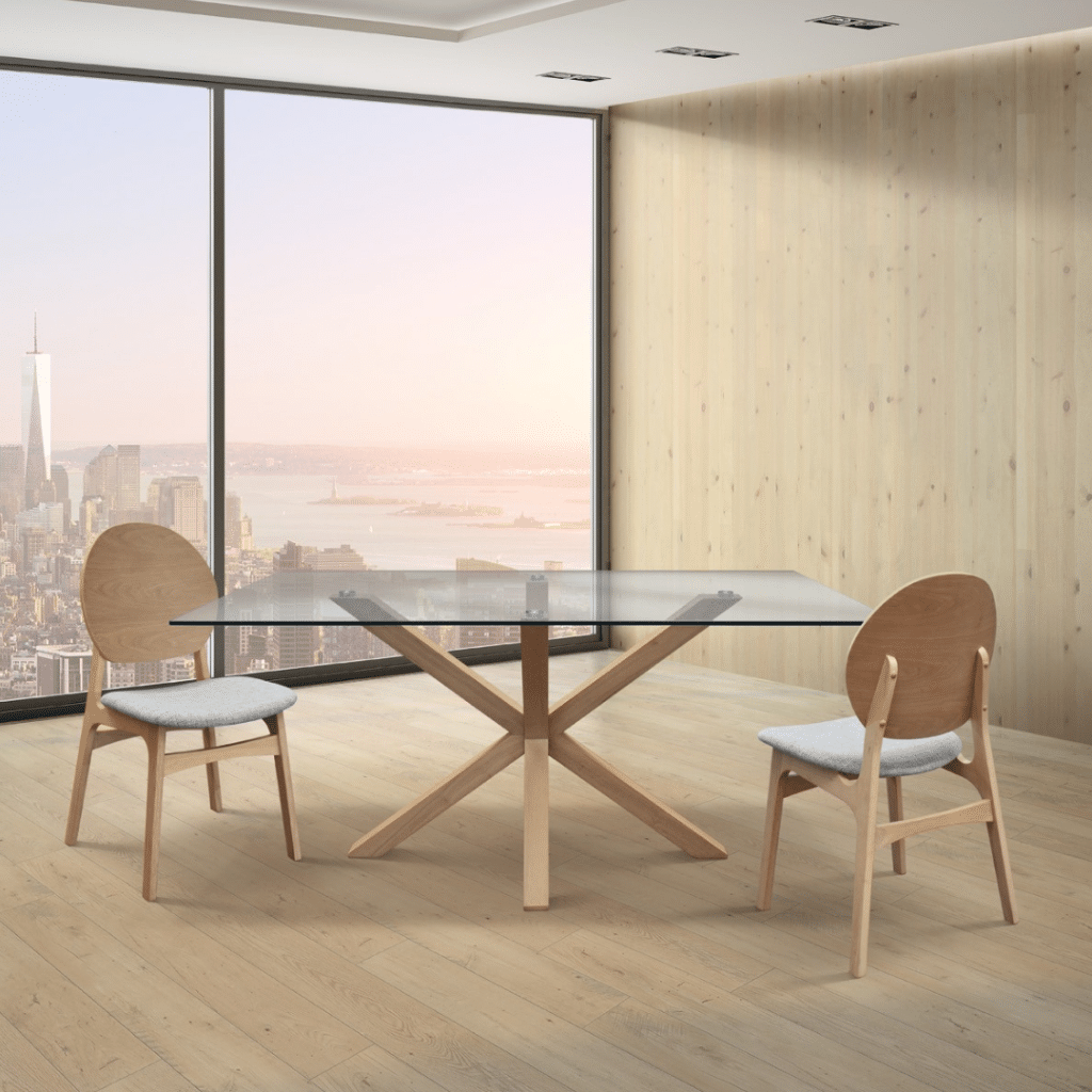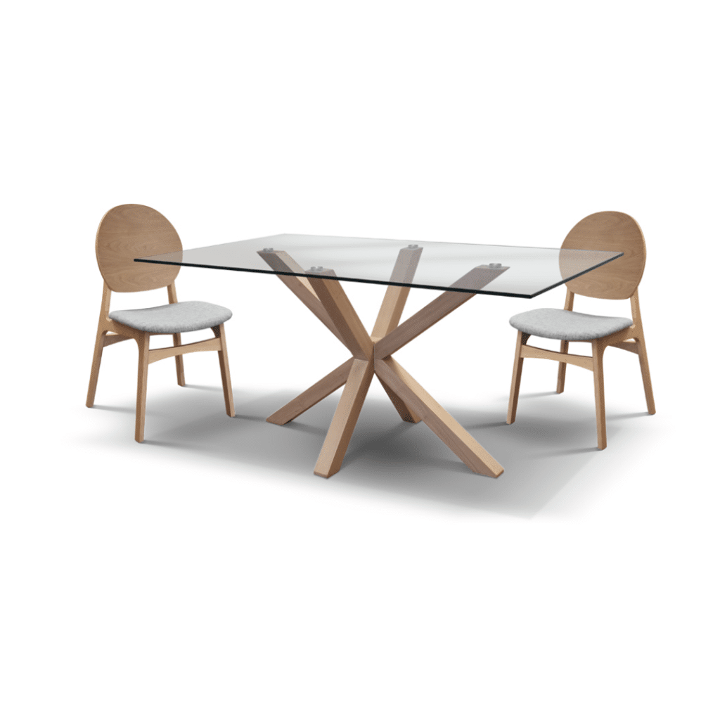 Beneficiile acestei mese sunt multiple: blatul din sticlă este ușor de întreținut și conferă un aspect luminos încăperii, iar picioarele din lemn asigură stabilitate și durabilitate. Ideală pentru spații de dining, această masă este perfectă pentru a crea un ambient primitor și modern, fiind o investiție practică și estetică pe termen lung.