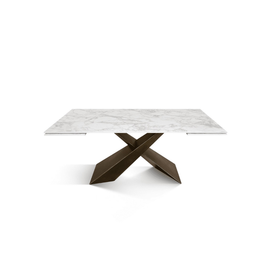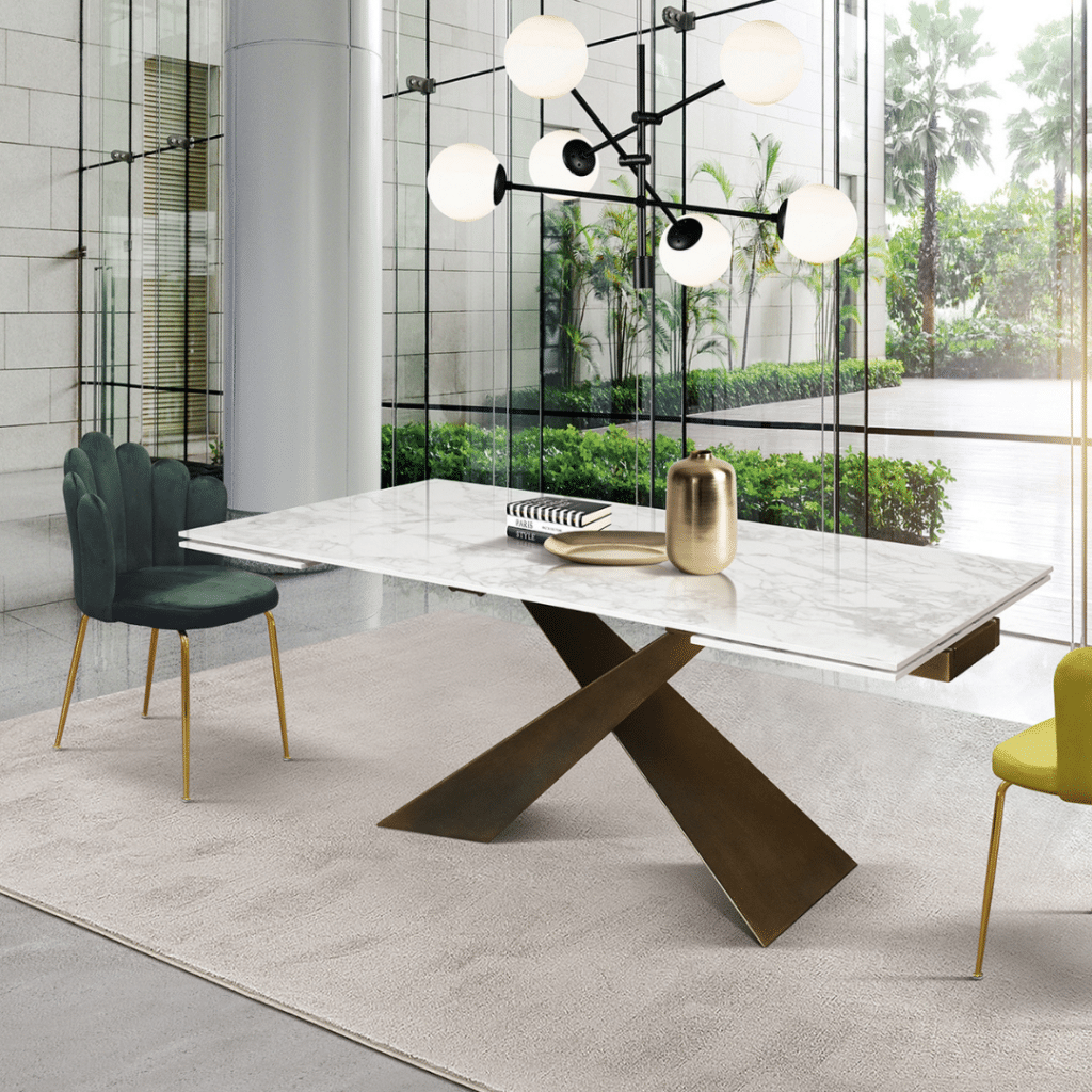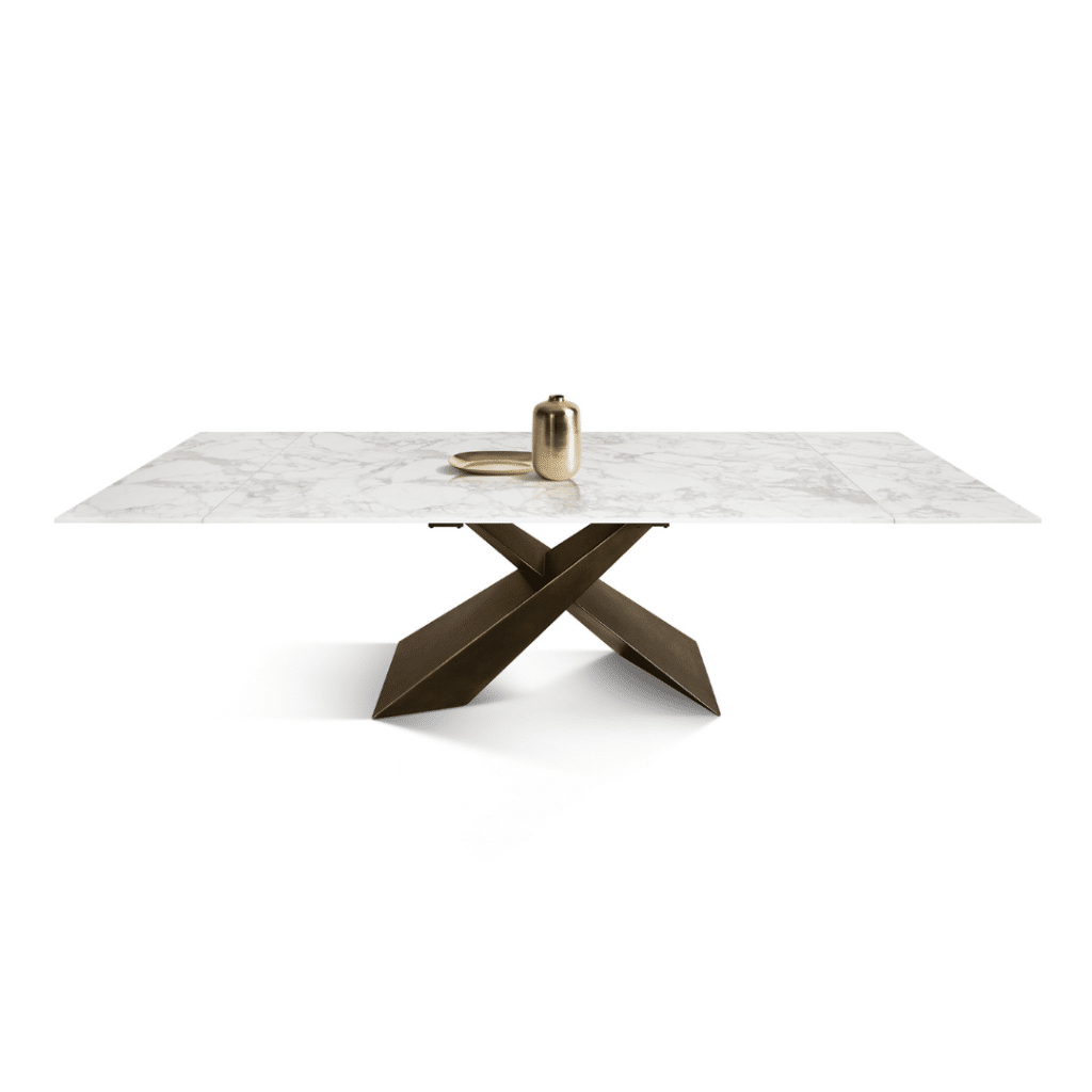 Masa MIRABELLE cu blat dreptunghiular din ceramică alb arabesc și picioare metalice în nuanță de bronz reprezintă alegerea perfectă pentru un spațiu modern și elegant. Designul său sofisticat combină durabilitatea ceramicii cu stabilitatea oferită de picioarele din fier încrucișate, adăugând un plus de stil oricărei încăperi. Ideală pentru dining-uri contemporane, această masă extensibilă oferă funcționalitate și rafinament în același timp.