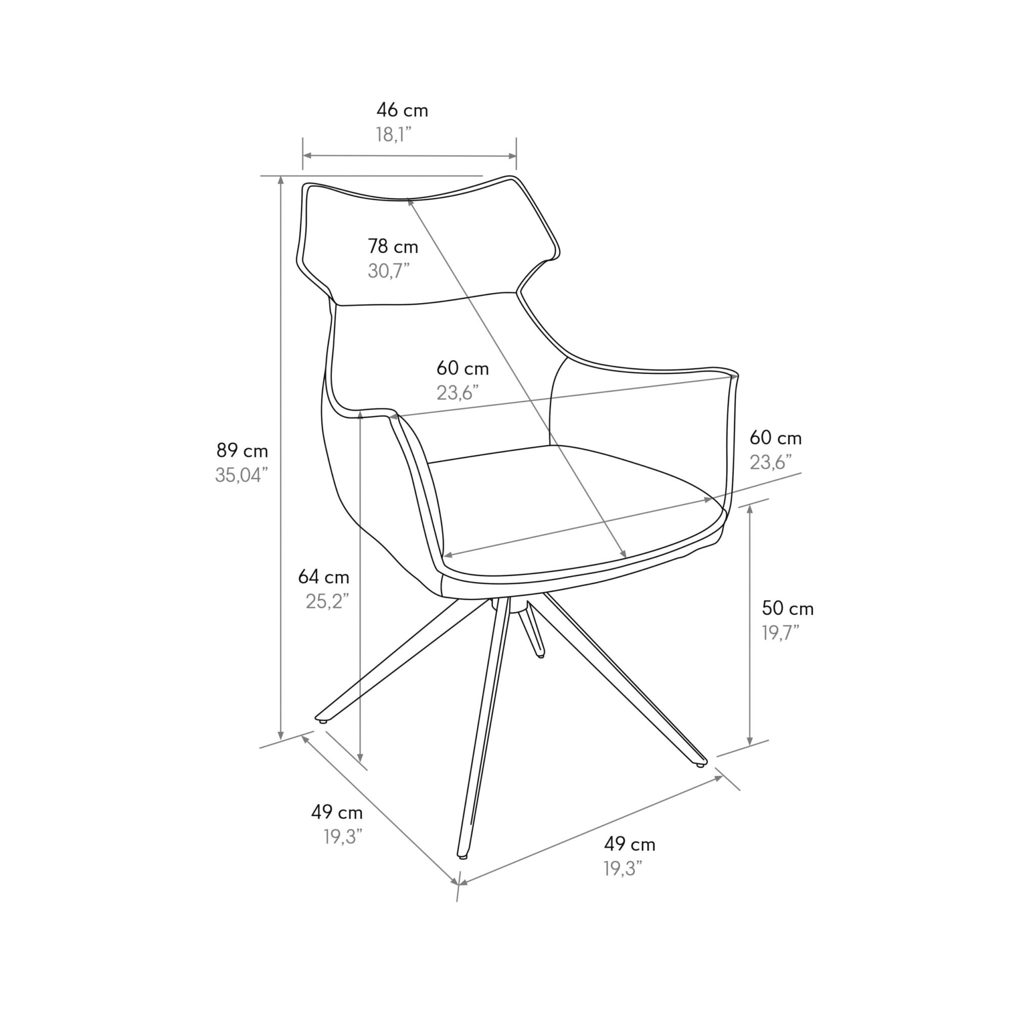 Lățime 60 cm; Adâncime 49 cm; Înălțime 89 cm; Înălțime șezut 50 cm