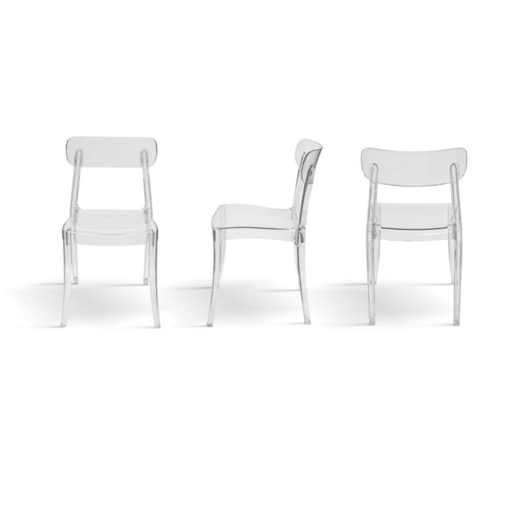 Acest scaun transparent este durabil și rezistent la razele UV, zgârieturi și alți factori externi, fiind ideal pentru spațiile cu trafic intens. Ușor de întreținut și combinat cu alte piese de mobilier, oferă confort și stabilitate în orice context, de la bucătării și birouri până la terase și săli de evenimente. Alege un scaun practic, estetic și rezistent, care să îți completeze perfect amenajarea.