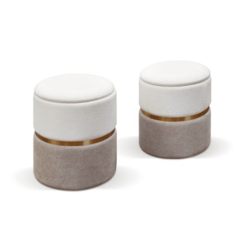 Setul GOLD 2 tabureți aduce un plus de eleganță și funcționalitate în orice living sau spațiu de relaxare. Confecționați dintr-o combinație rafinată de MDF și țesătură în nuanțe delicate de alb cu bej, acești tabureți cu spațiu de depozitare sunt decorați cu o bandă metalică aurie, care le oferă un aspect modern și sofisticat. Designul inteligent, cu două dimensiuni diferite, permite economisirea spațiului prin depozitarea taburetului mic în interiorul celui mare.