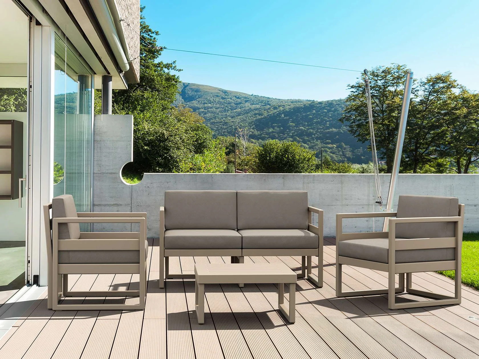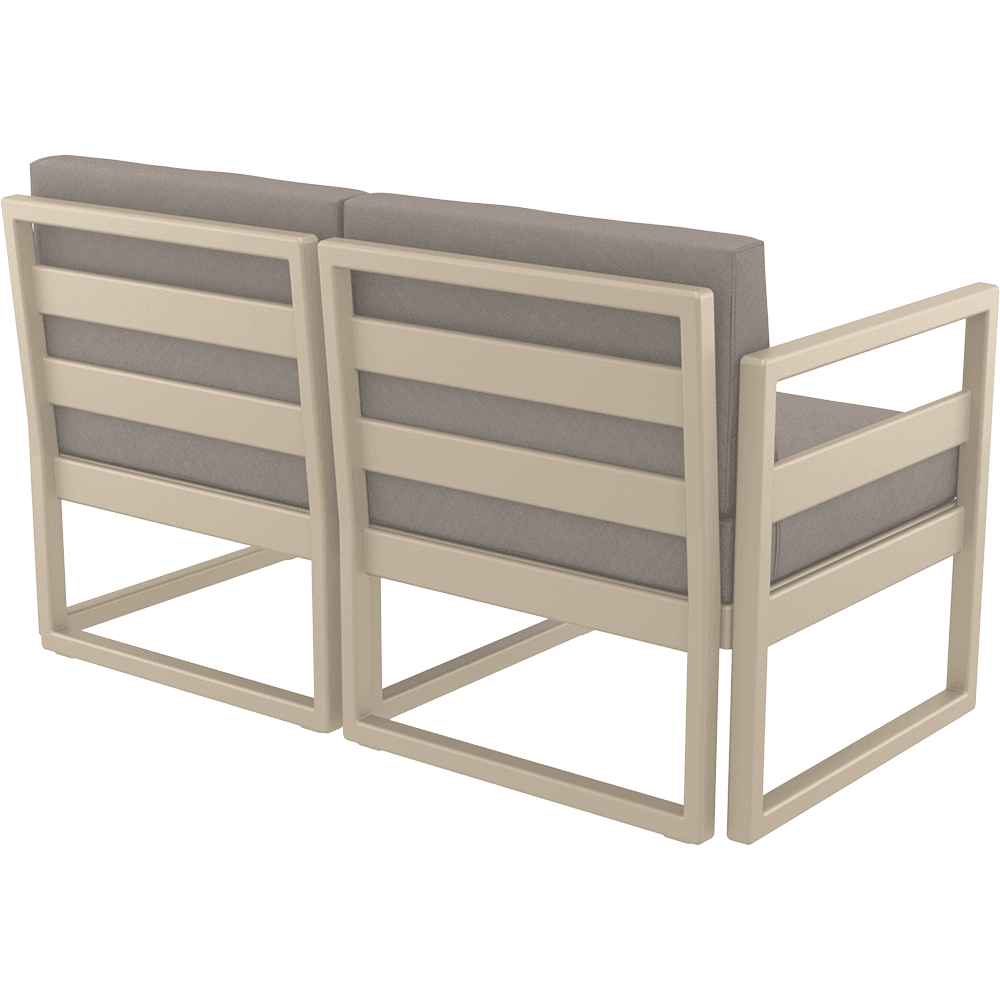 Materialele sunt durabile, ușor de întreținut și rezistente la intemperii, raze UV și uzură, fiind potrivite pentru utilizare intensivă în cafenele, hoteluri, restaurante sau acasă, realizate pe structură rezistentă, cu finisaj modern și perne confortabile pentru relaxare zilnică.