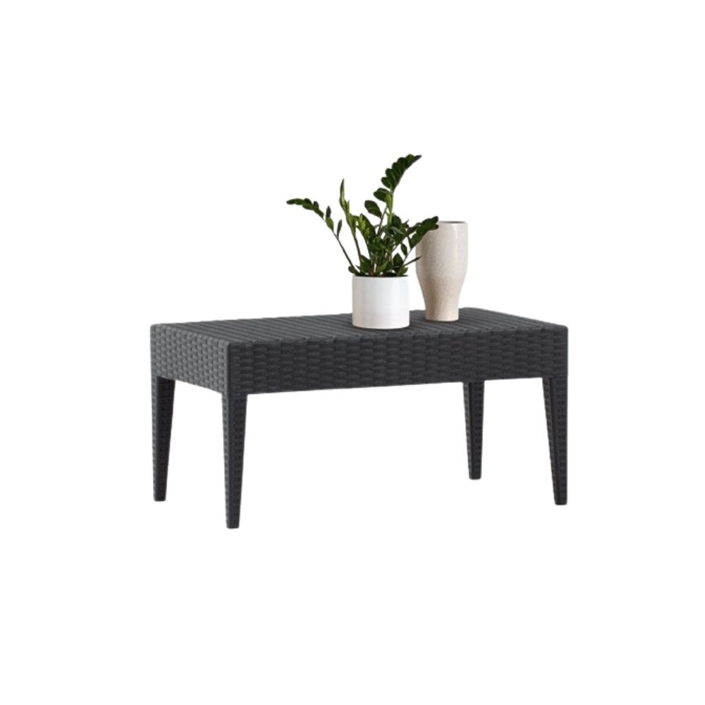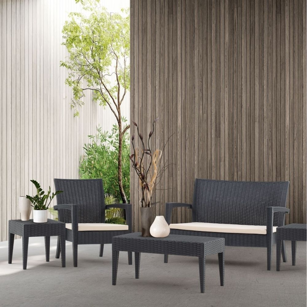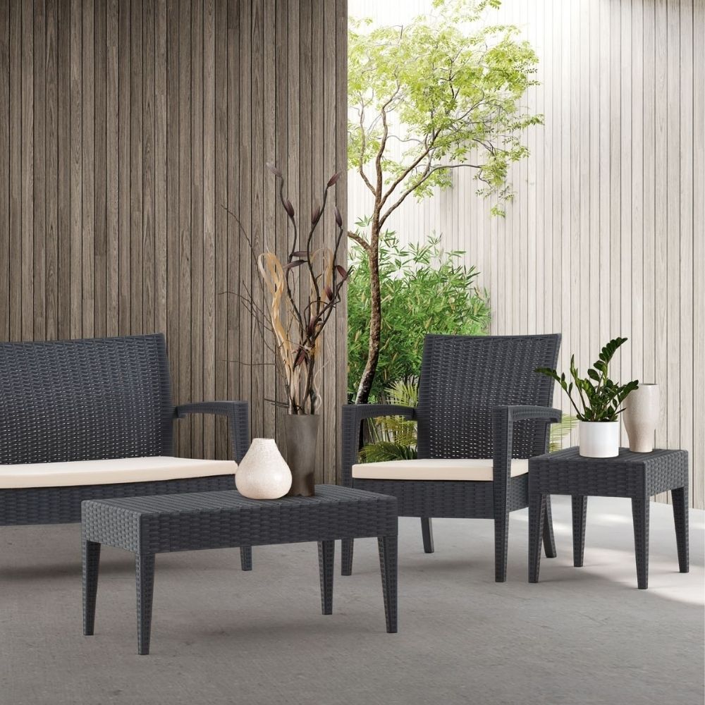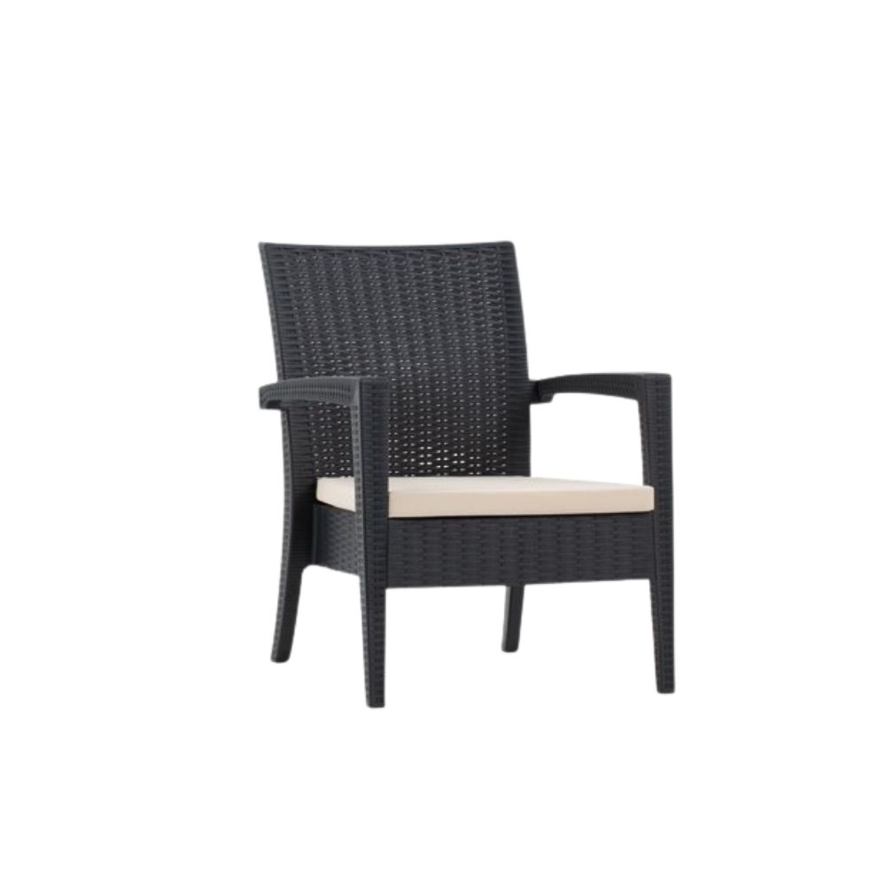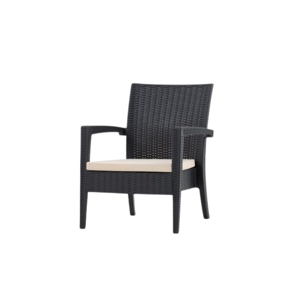 Materialele sunt durabile, ușor de întreținut și rezistente la intemperii, raze UV și uzură, fiind potrivite pentru utilizare intensivă în cafenele, hoteluri, restaurante sau acasă, realizate pe structură rezistentă, cu finisaj modern ANTRACIT și perne confortabile pentru relaxare zilnică.